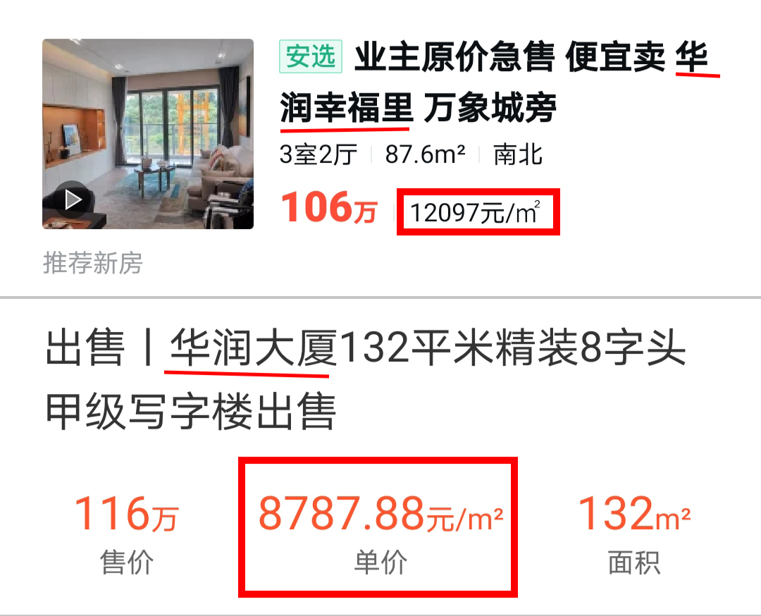 华润幸福里70年产权的二手货住宅申报价为12097元/㎡,而华润大厦写字楼的申报价为8787.88元/㎡!其中差价甚大。购买了住宅的会喜不自禁,而入手了写字楼的看到如此差价,其内心感想只能自行体会了。写字楼与商铺,两者只能依靠租金,其升值幅度非常有限,卖出税费还高,流通性差,变现困难。因此,商铺和写字楼,一踩一个坑!除了资深老手,能不碰就千万别碰!最后,楼叔要说的是,买房是人生中的重要大事件之一,不容一点差错,大家买房的时候一定要小心而为。楼叔身边就有不少朋友为此吃过哑巴亏,楼叔的前同事小敏,在大前年年末的时候以单价68万元入手了柳江拉堡某个楼盘下的临街商铺,单价约需1.4万/㎡,自以为会狠狠的赚上一笔,结果由于2020年突发的疫情,生意不好做,挂了几个月的门面出租,也没有人询问,最后把嫁妆本都赔里边了。买房无小事,谁的钱也不是大风刮来的,一定要看准了下手!多问多看多比较,准没错~实在不行,还有楼叔在呢。•END•来源:桂林楼叔出品商务合作: