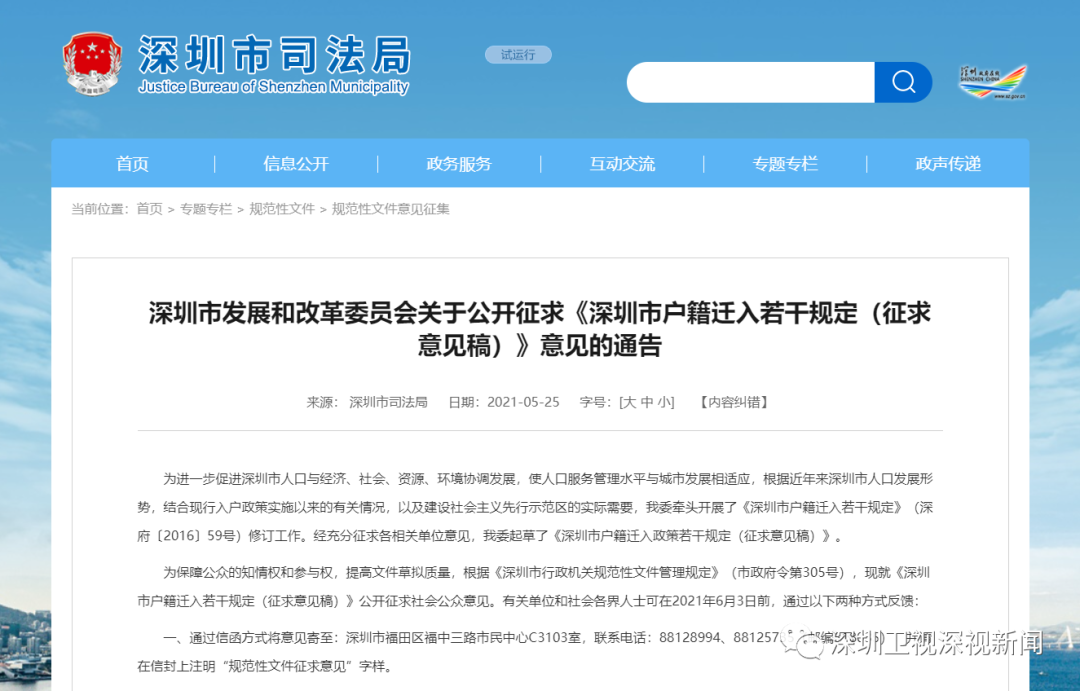 更多精彩,请点击上方蓝字关注我们!5月26日,深圳市司法局官网显示,近日,深圳市产业发展和体制改革委员会发布《深圳市户口迁出若干明确规定(草案稿)》。