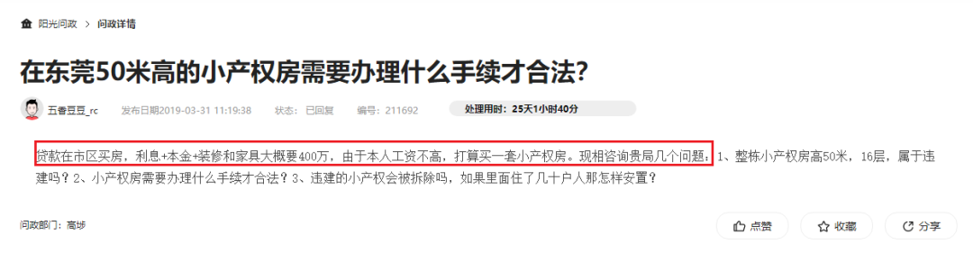 佛山市住建局也同样一遍一遍的回复着:小产权房并不适用法律法律法规对商品住宅的有关规定,一旦发生纠纷,小产权房购买人的有关权益将较难得到保障,建议不要购买。